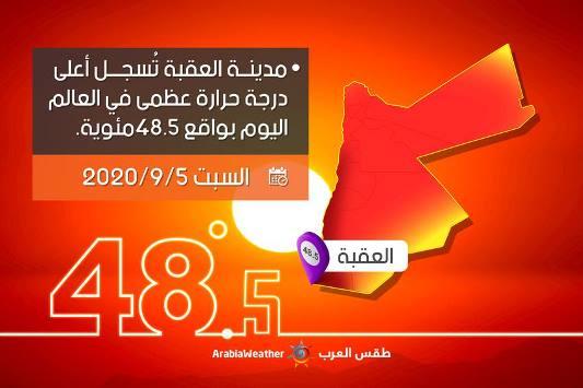 قال موقع طقس العرب إنه وبعد اكتمال تسجيل درجات الحرارة العظمى لليوم الجمعة بحسب منظمة الأرصاد العالمية المسؤولة عن تجميع درجات الحرارة الم سجلة لغايات التوثيق من مراصد الدول فقد احتلت مدينة العقبة ثاني أعلى درجة.