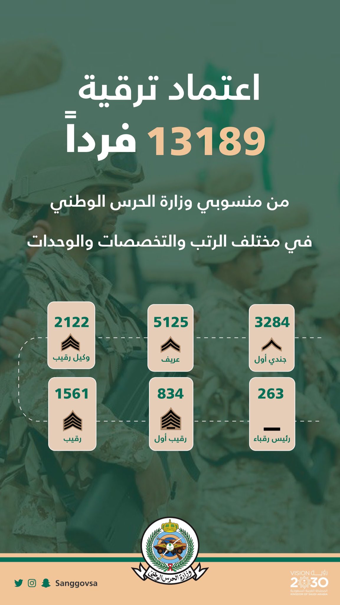 وزارة الحرس الوطني A Twitter اعتماد ترقية 13189 فردا من منسوبي وزارة الحرس الوطني في مختلف الرتب والتخصصات والوحدات